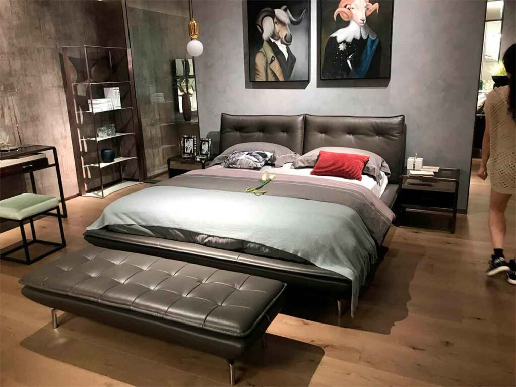 מיטה זוגית מדגם פאקו בעלת עיצוב אולטרה מודרני וכוללת כרית פינוק לאורך כל המסגרת ושילוב של רגלי ניקל חדשניות.
