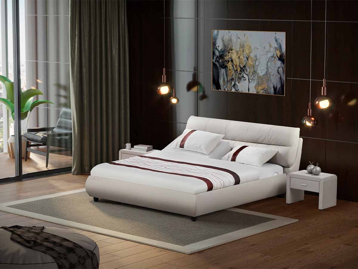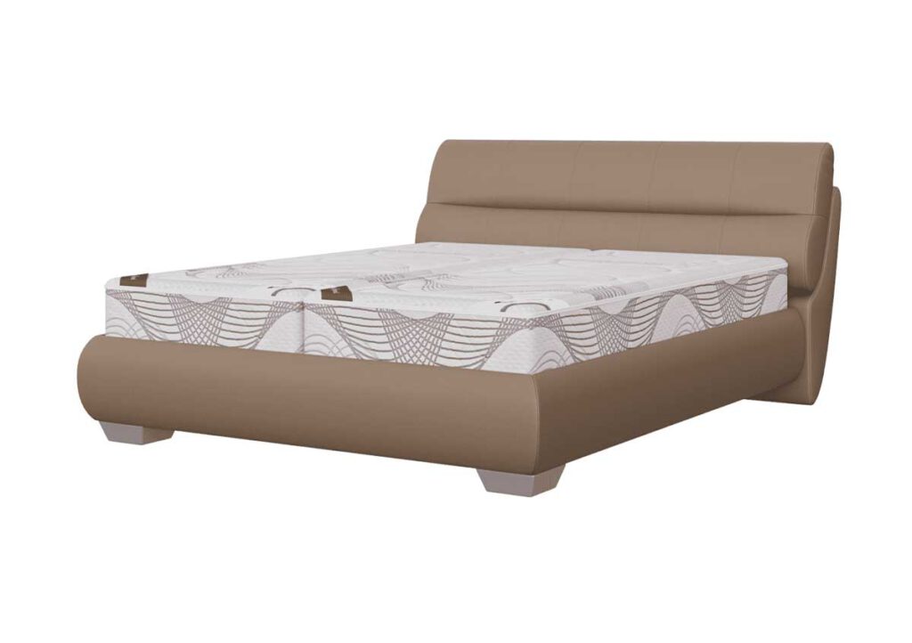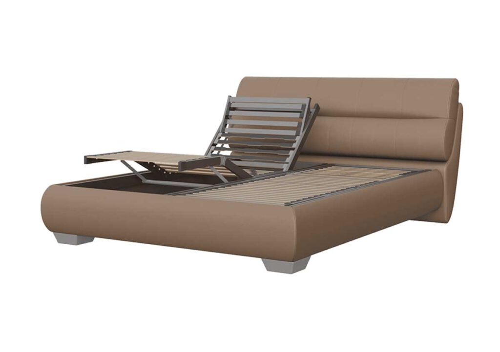 מיטת מעצב בגימור עור משולב (גב המיטה עור והדפנות דמוי עור) בד או עור מלא, זוג משטחים אורתופדיים מתכווננים תוצרת גרמניה ומזרני ויסקו/לטקס לבחירה מתוך מבחר מזרנים.